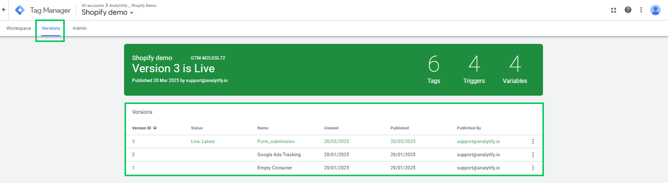If something doesn’t work as expected or breaks your tracking setup, you can simply roll back to an older version with a single click. It’s like having an “undo” button for your website tracking. This prevents mistakes from causing significant problems on your site.