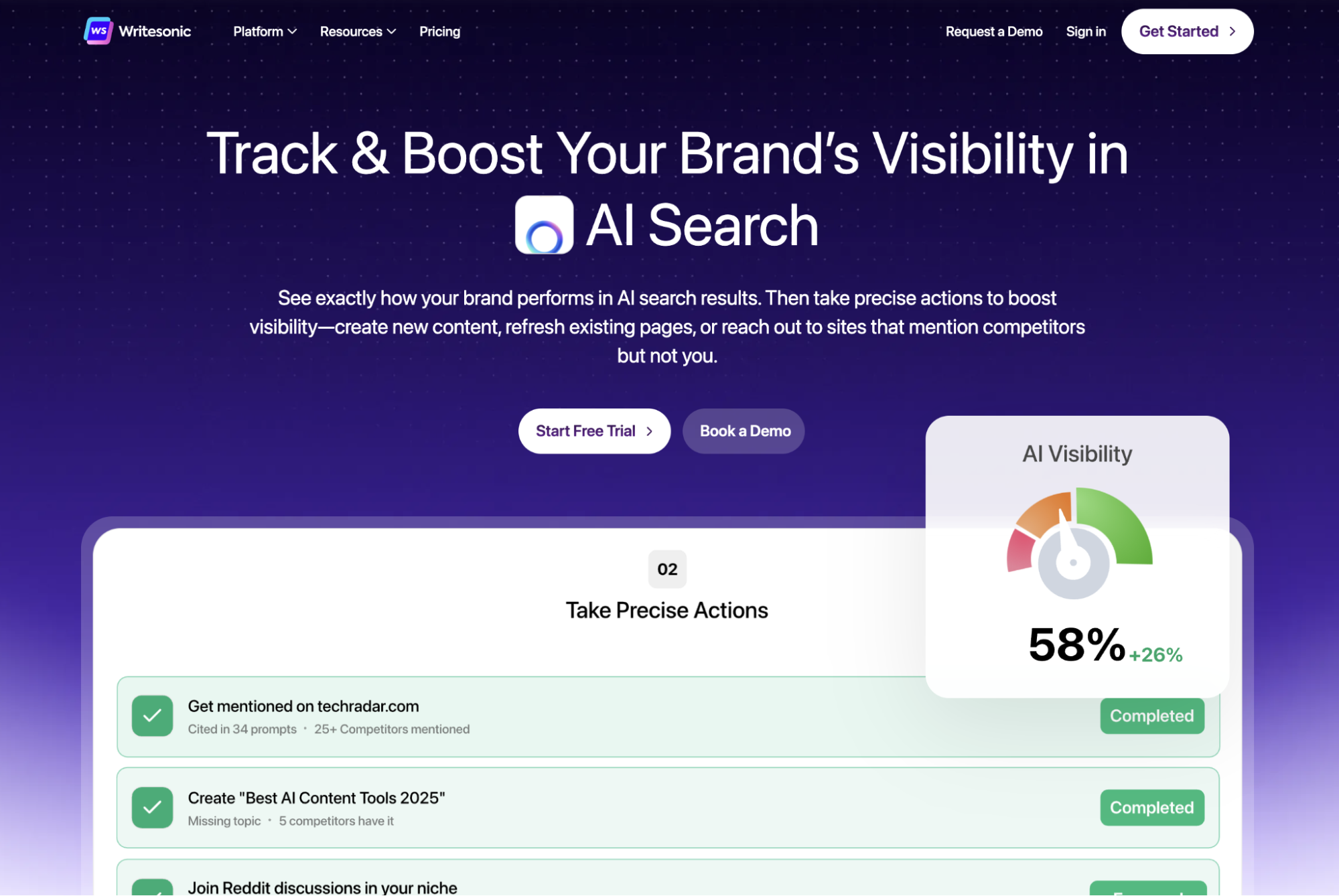 Next on our list of top AI tools for search visibility is Writesonic, though visibility alone doesn’t quite do it justice. While that’s definitely part of the equation, Writesonic is better defined as a comprehensive Generative Engine Optimization (GEO) and SEO platform, built to help brands monitor, analyze, and improve how they appear across AI-generated responses.