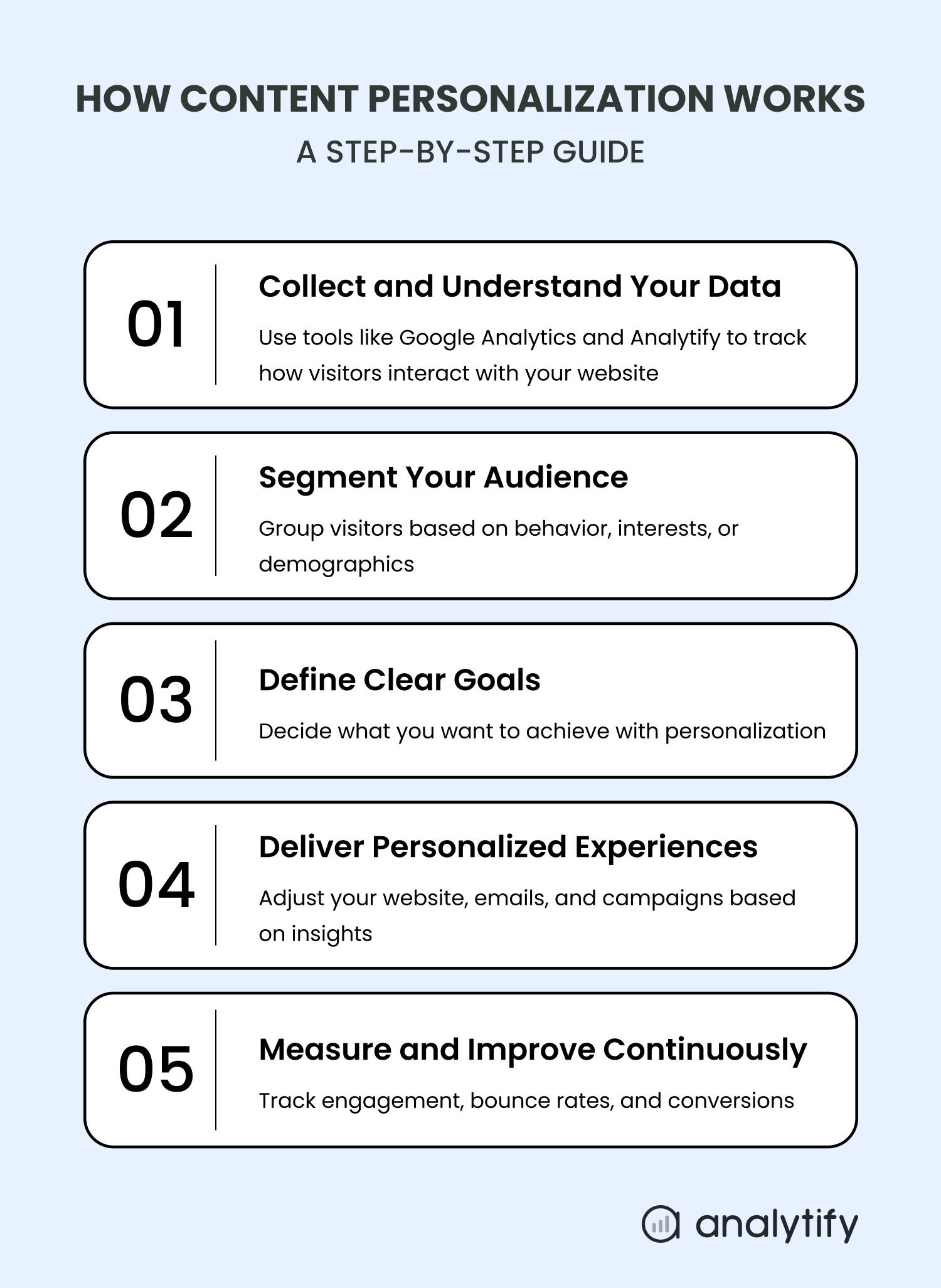 Content personalization works by turning user data into meaningful experiences. It starts with collecting information about how people interact with your website. Then, that data is used to show content that fits each visitor’s interests. Then it helps in boosting engagement, conversions, and satisfaction.