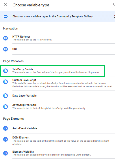 - Under variable configuration, select 1st Party Cookie as the variable type.