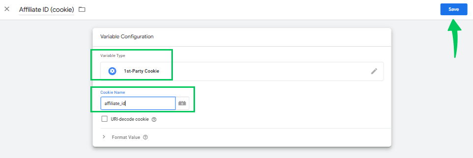 - The created Tag and Trigger only store the affiliate ID in the cookie. Next, create a variable to read the cookie: For this:
