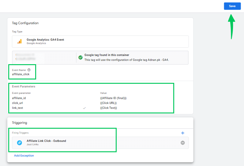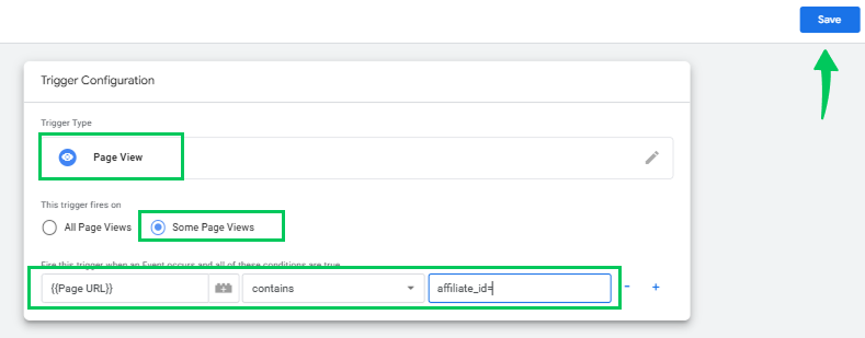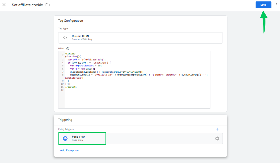 - Add the newly created Affiliate ID Page View trigger and connect it with the tag.