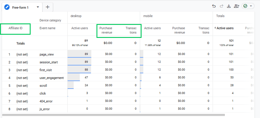 This will show affiliate sales performance broken down by each affiliate ID. You can also add filters to focus on purchase events only.