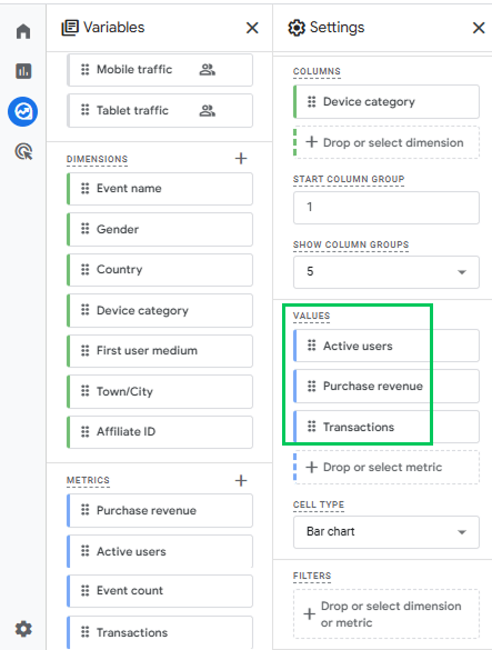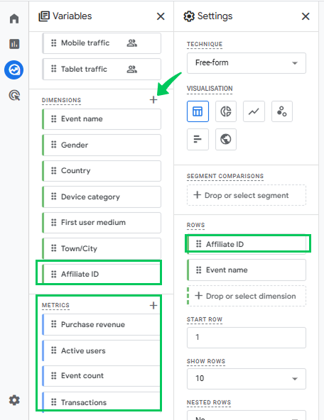 - In the Variables panel, click on the plus sign parallel to Dimensions and Import Affiliate ID (your custom dimension), along with any other useful dimensions, such as Page title or Device category.