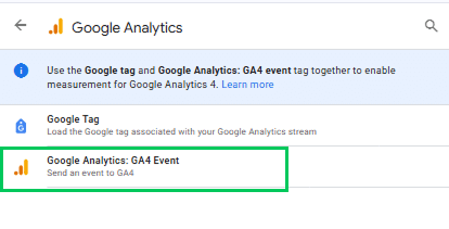 - Next, choose Google Analytics as the tag type. Then, select Event GA4.