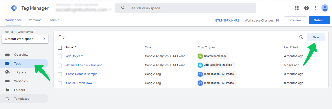 - Next, to create a GA4 Event tag in Google Tag Manager, go to Tags and click New.