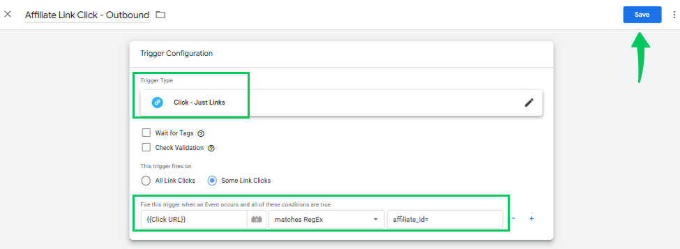 - Condition: Click URL matches RegEx affiliate_id=|ref=|aff= (adjust to your link parameter patterns)