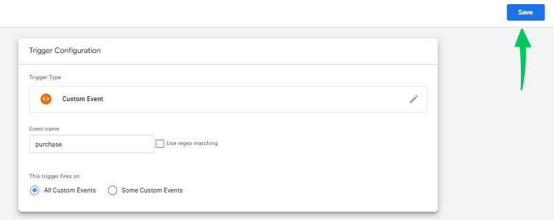 - For Triggering, select Custom Event and set the Event Name to purchase (this should match your dataLayer push).