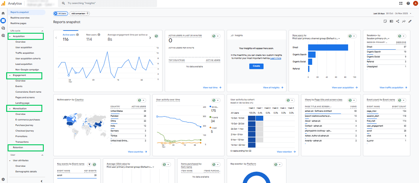 Engagement metrics in GA4 show how actively both new and returning users interact with your website. They help you understand what catches attention and what loses it.