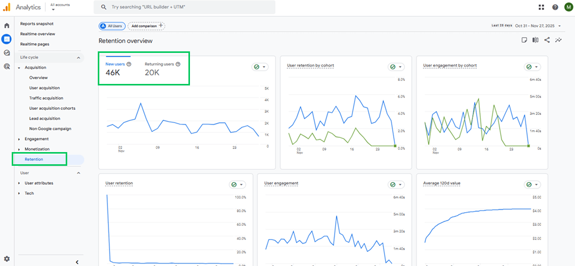 Loyalty and retention metrics show how often people return and how valuable your returning users are. These insights help you build long-term relationships.