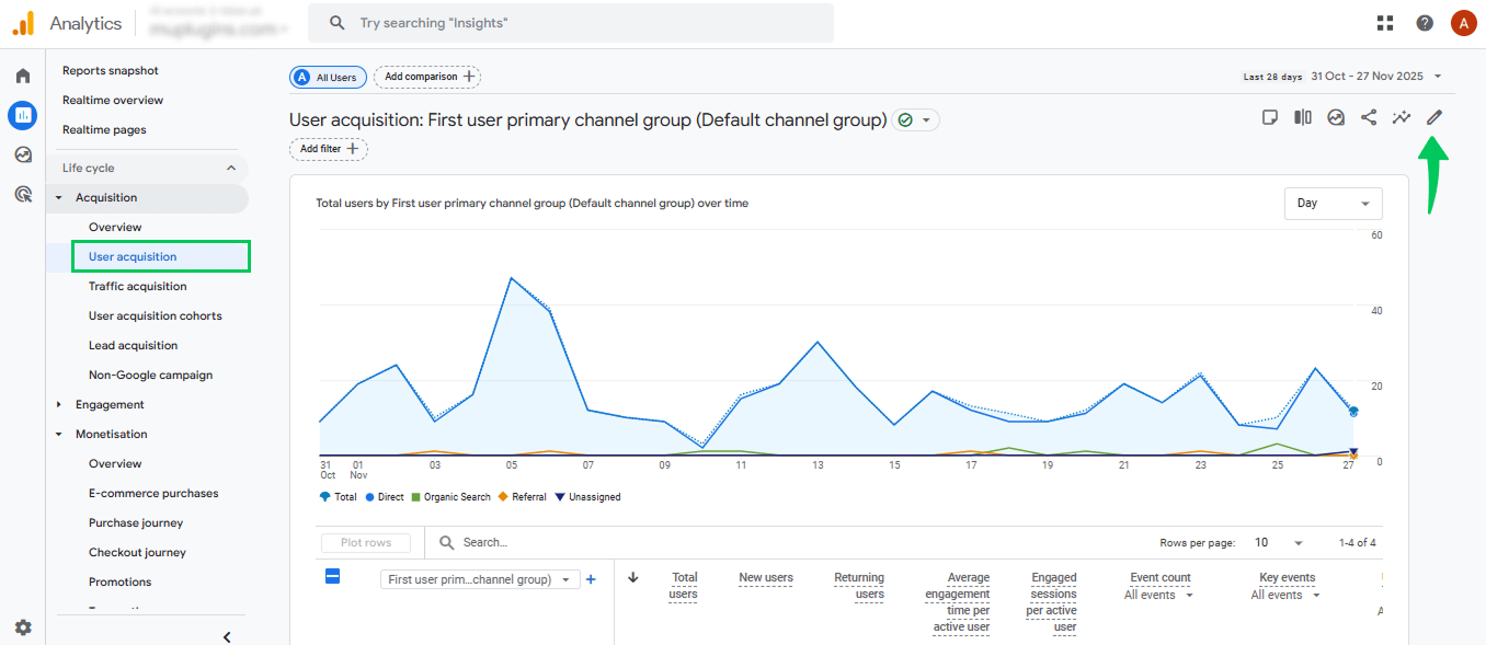 GA4 shows where users are coming from in the Traffic Acquisition report, helping you understand overall WordPress user behavior. This report breaks down all traffic sources, including Organic Search, Social, Email, and Referral channels. You can also switch to Source/Medium to get even deeper insight into which platforms drive quality visitors.