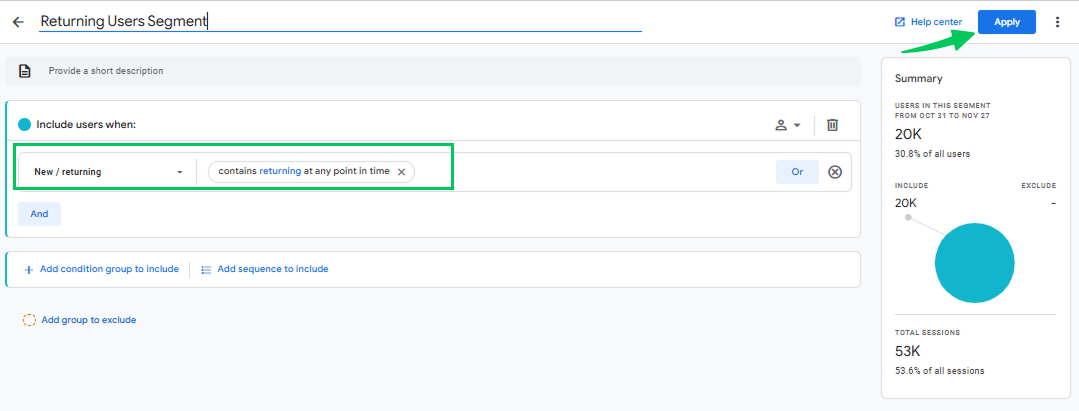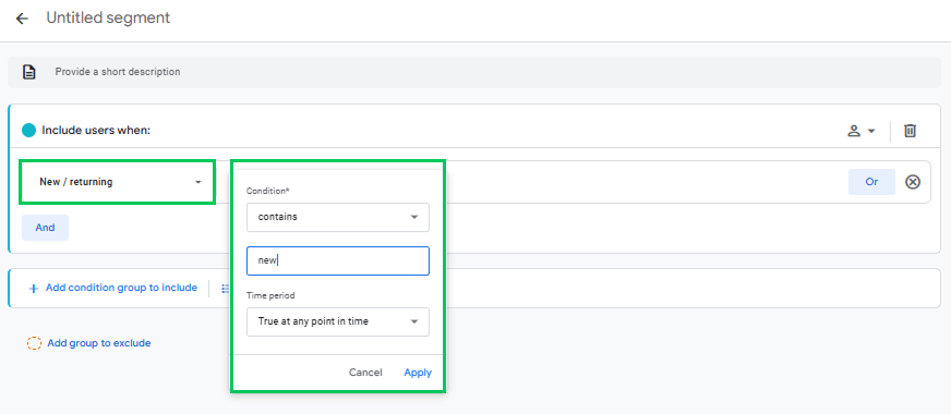 Once you’ve reviewed the built-in reports, the next step is to create dedicated segments for New and Returning Users to analyze their behavior more closely.