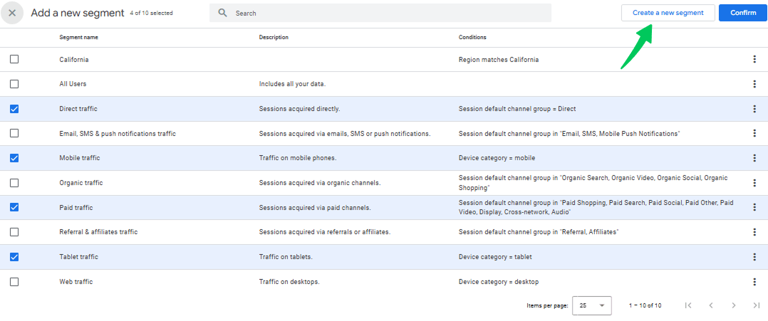 - Click on the Create a new segment tab.