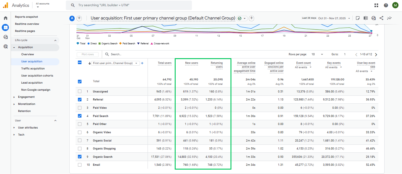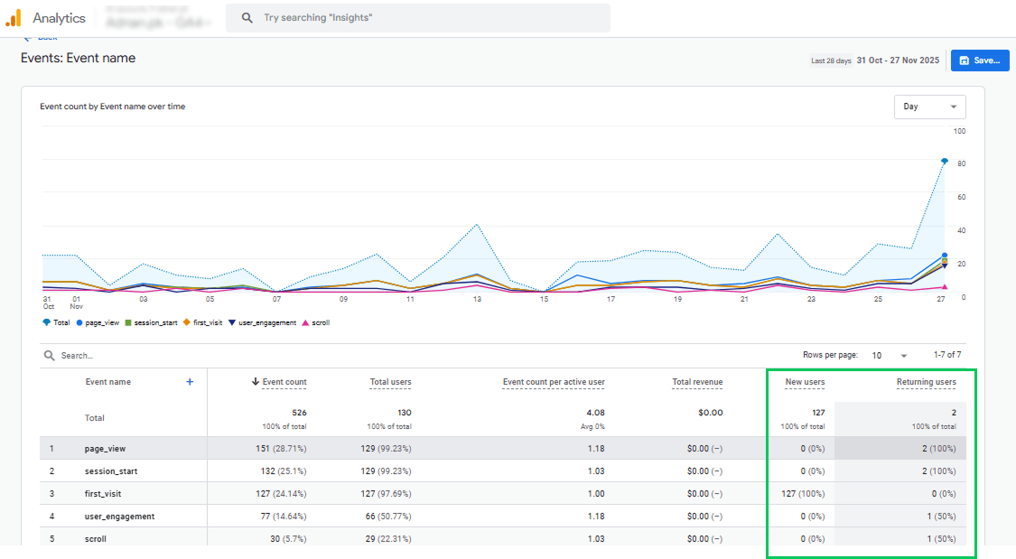 After confirming that every report is showing the New Users and Returning Users metrics, open any GA4 report and review the table to compare both audiences side by side.