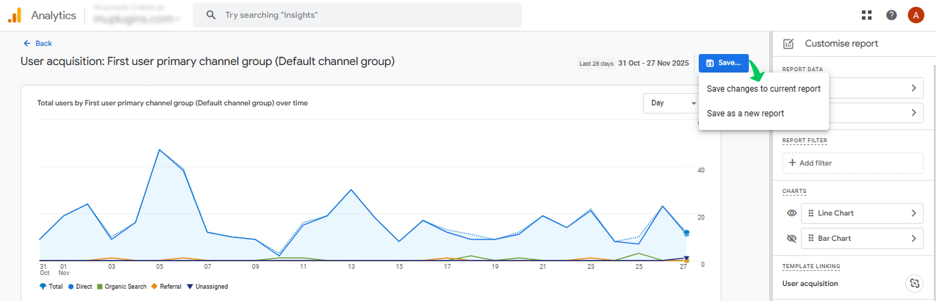 - Open any report (e.g., User Acquisition).