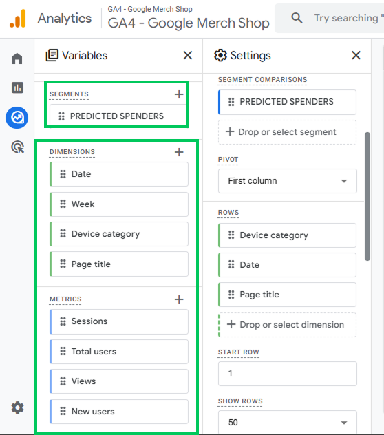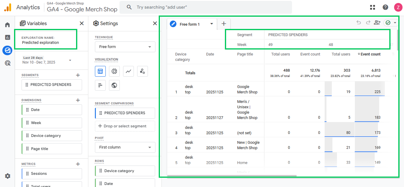 Once you build the Free-Form exploration with the Predicted Spenders segment, GA4 shows you exactly how high-value users behave on your site.