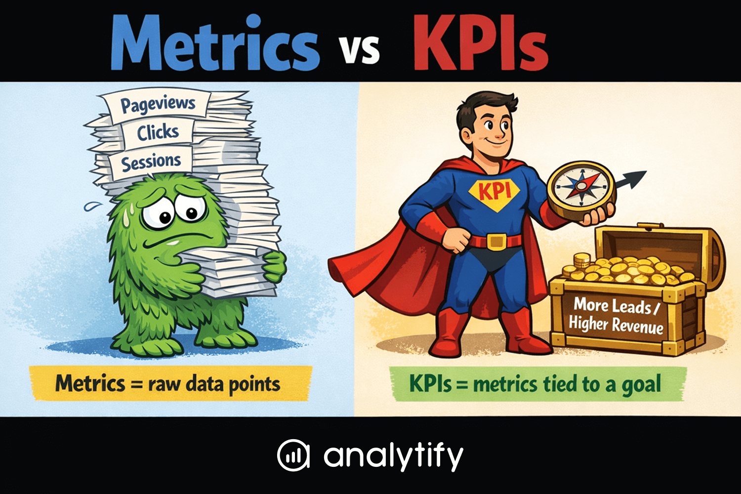 Metrics are raw data points. Pageviews, sessions, clicks, events.