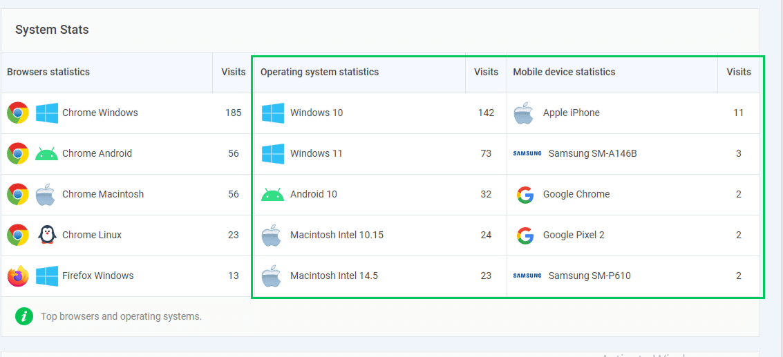 The System Statistics report breaks down visits by browser, operating system, and specific devices (like iPhone models, Android devices, or desktop systems). It gives you insights to optimize UX and performance for your most-used devices.