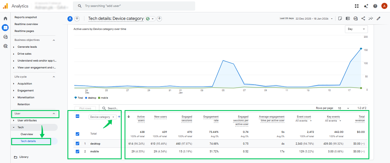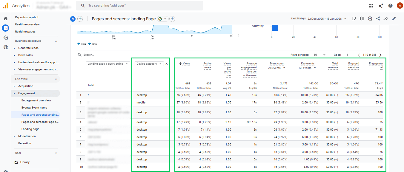 This view is ideal for quickly comparing mobile vs desktop analytics in GA4 and spotting high-level engagement trends.