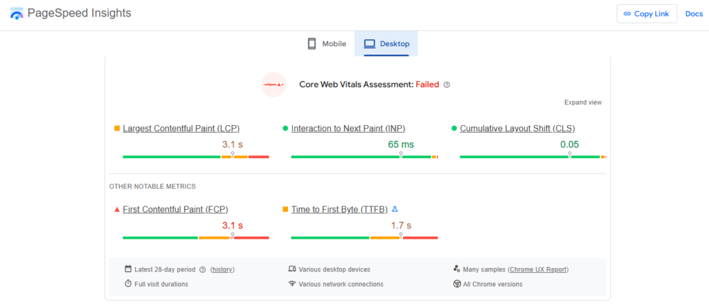 Core Web Vitals are assessed using mobile data by default, even for desktop-heavy sites. If your mobile performance is weak, desktop improvements alone won’t help you pass the Core Web Vitals assessment.