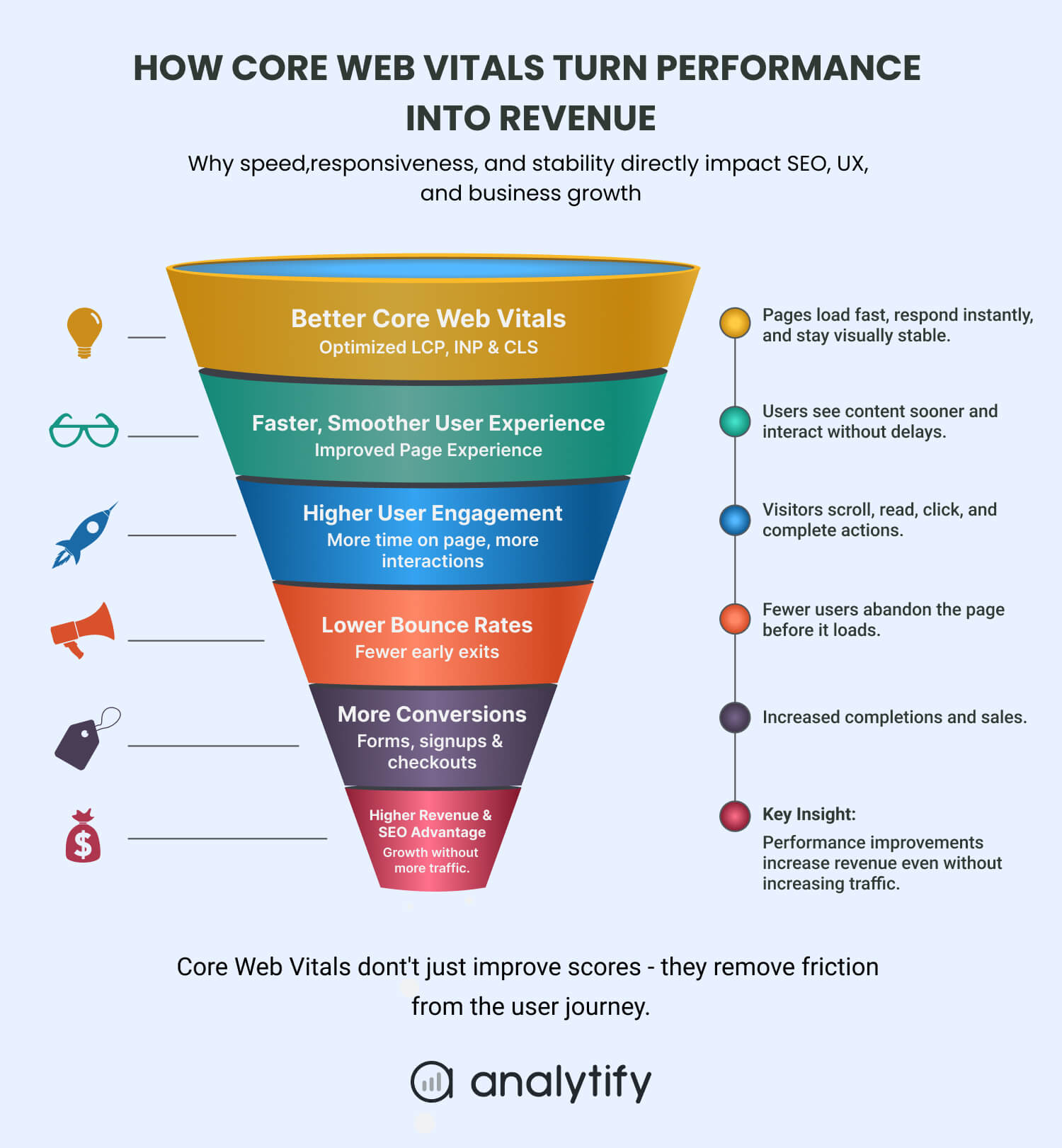 Core Web Vitals improvements influence user behavior in measurable ways. Faster Largest Contentful Paint reduces early exits and encourages users to stay on the page. Better Interaction to Next Paint improves form completion, navigation flow, and checkout responsiveness. Stable layouts with low Cumulative Layout Shift reduce misclicks and build trust. Together, these improvements help move users smoothly through conversion paths, increasing engagement and revenue without changing content or traffic sources.